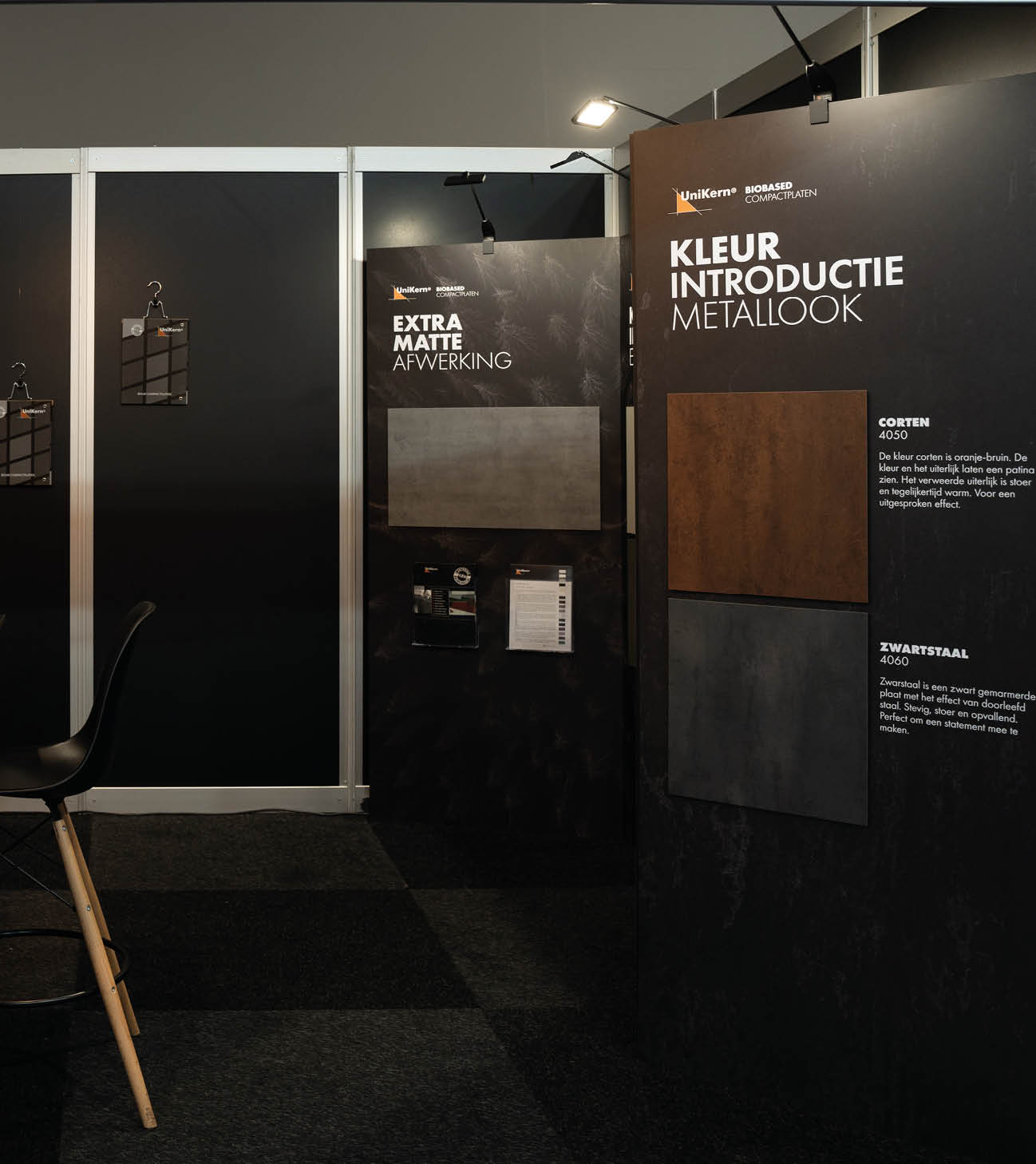 Deze eigenschappen vormden de basis voor het verhaal én de visuele stijl. Voor de Bouwbeurs ontwikkelden we een krachtig beursconcept, waarin biobased de hoofdboodschap was. Met een uitgesproken stijl; veel zwart, grafische contrasten en beeld van bomen – wisten we een kleine stand een grote opvalwaarde te geven. De stand werd gebouwd door BuildingSuits zelf, met UniKern compactplaten als tastbaar bewijs van het product.