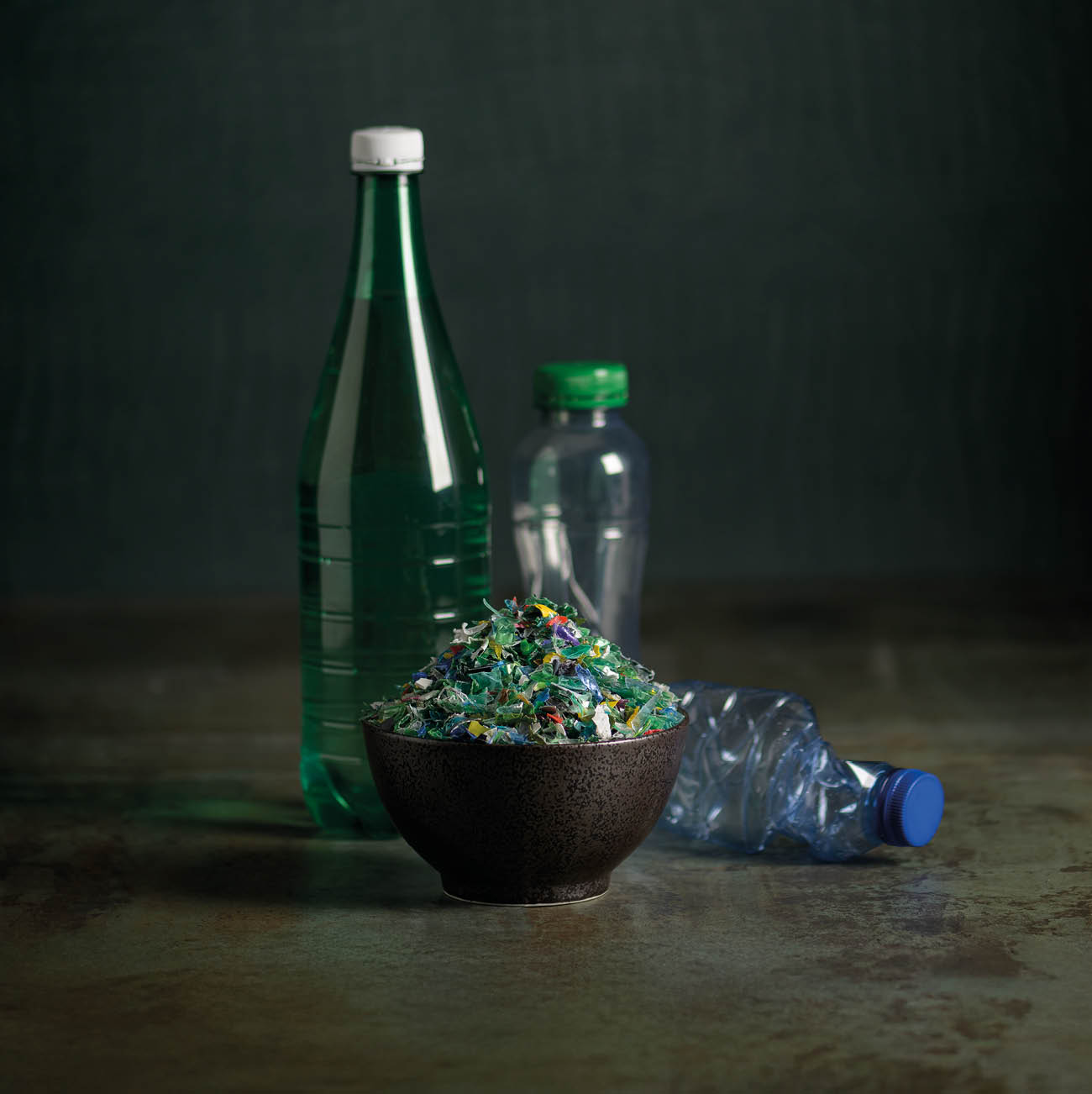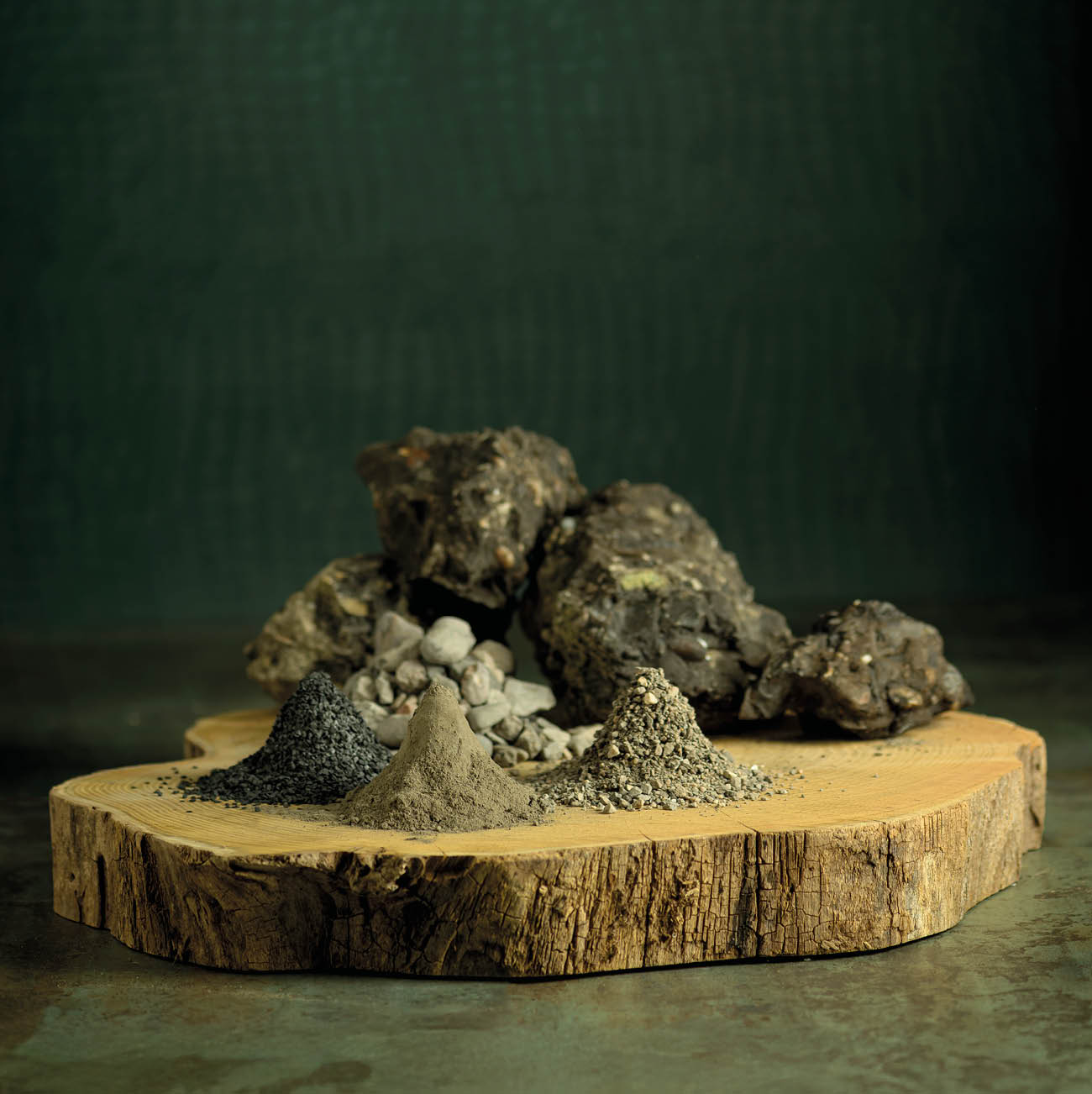 Het eerste concept vertrok vanuit ambacht en materiaal. De herwonnen grondstoffen werden benaderd als pure ingrediënten: gemalen asfalt als pigment, zwevend door de ruimte. In een industriële setting, met uitzicht op fabriekspanden en platte daken, werkte een vakman met focus en energie. De grondstof stond letterlijk centraal.